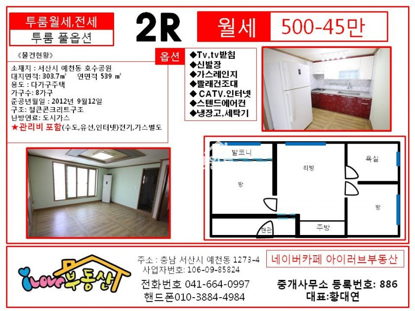 *옵션 : 스텐드에어컨, 냉장고,가스쿡탑.에어컨.신발장.빨래건조대,가스쿡탑 ~      월세는 풀옵션시 tv,세탁기 추가로 옵션 넣어드립니다.