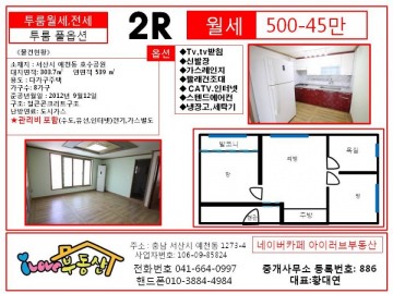 (평수측정) *강추투룸전세* 서산투룸 조용한 주택가 전세/월세가능~월세는 풀옵션