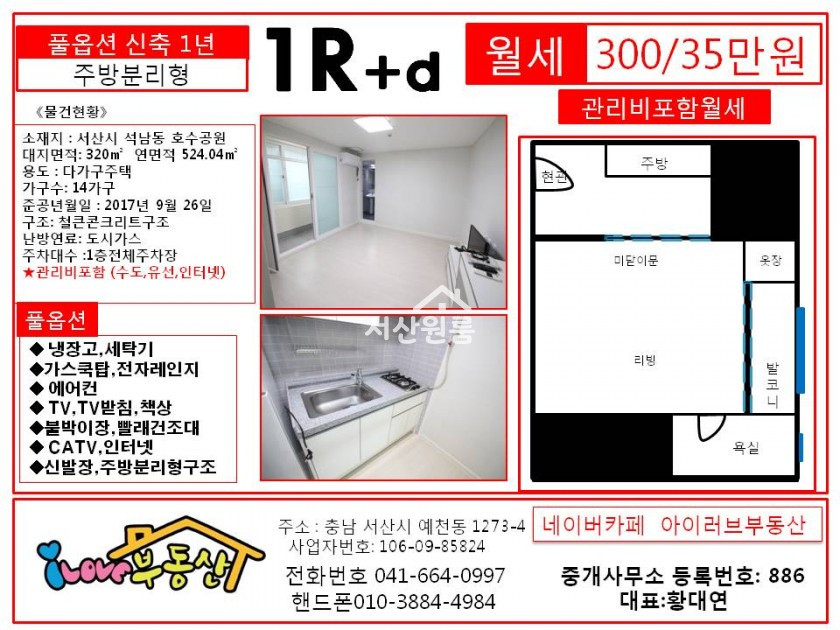 *보증금 300만 월32만원      **관리비3만월별도있음포함(수도,유선,인터넷포함)  *관리비포함월세 35만원