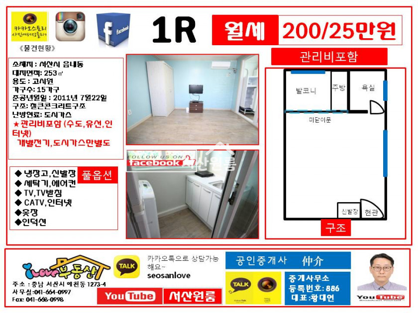 (평수측정) *급월세* 서산원룸 우체국인근 최저가 월세25만 관리비포함...