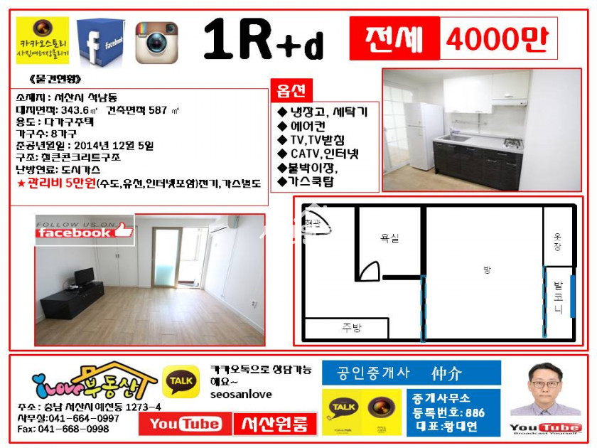 본 방의 영상을 유튜브에서도 확인가능합니다..유튜브에서 서산원룸 검색하시면 됩니다. ^^
