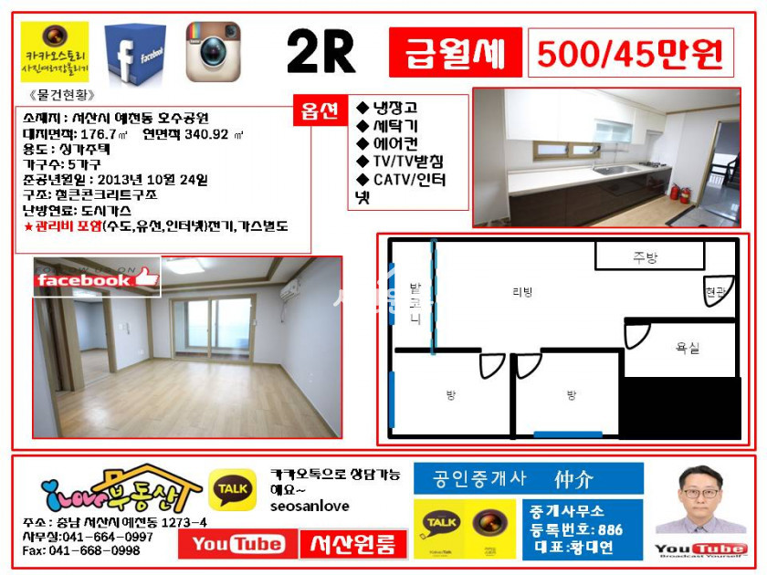 (평수측정) 서산투룸 호수공원 투룸중  가성비최고 월세45만원~풀옵션가능